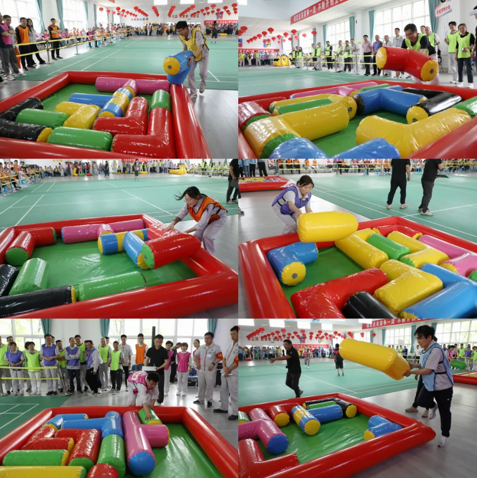 每队由4名队员组成。发令后,每人持一块道具跑向终点并摆放好然后返回起点,下一名队员接力,以此类推,直至摆放正确。