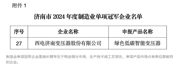 发布时间:2025-6-13近日,西电济变凭借在电力变压器领域的核心技术优势、卓越市场占有率及行业领先地位,成功获评“济南市制造业单项冠军企业”。这一荣誉的取得是对公司坚持创新驱动、深耕细分领域取得成果的充分肯定和高度认可。